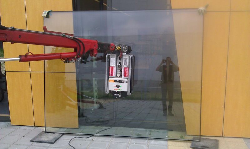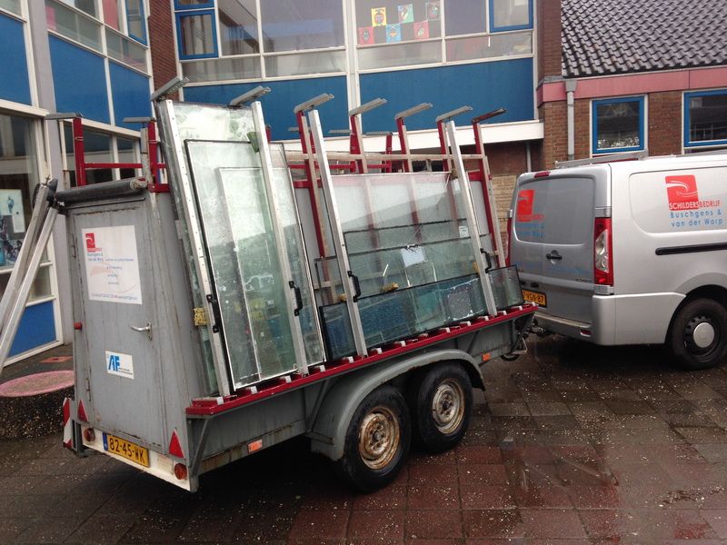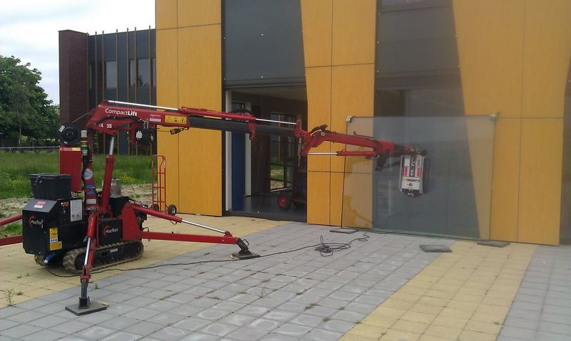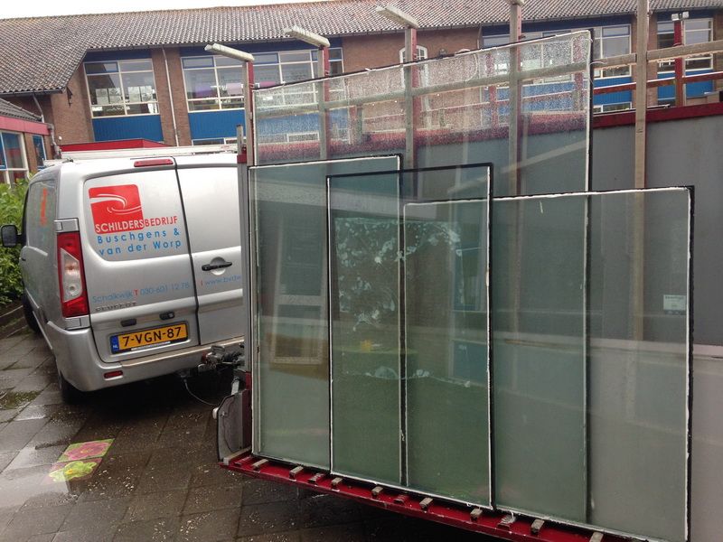 Bij zeer grote ruiten wordt er met een glaskraan glas gezet zoals op de foto's hieronder te zien is.
