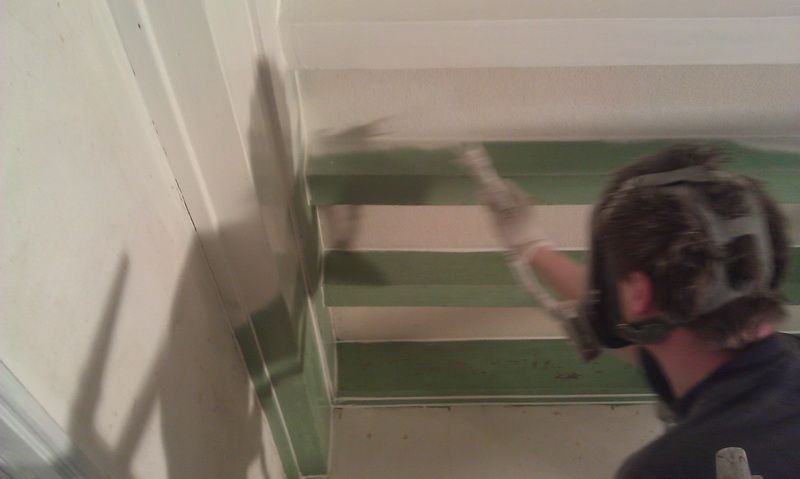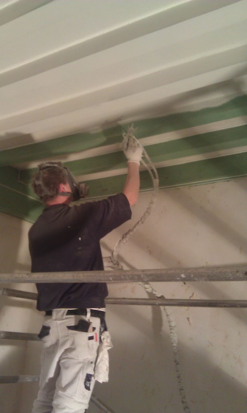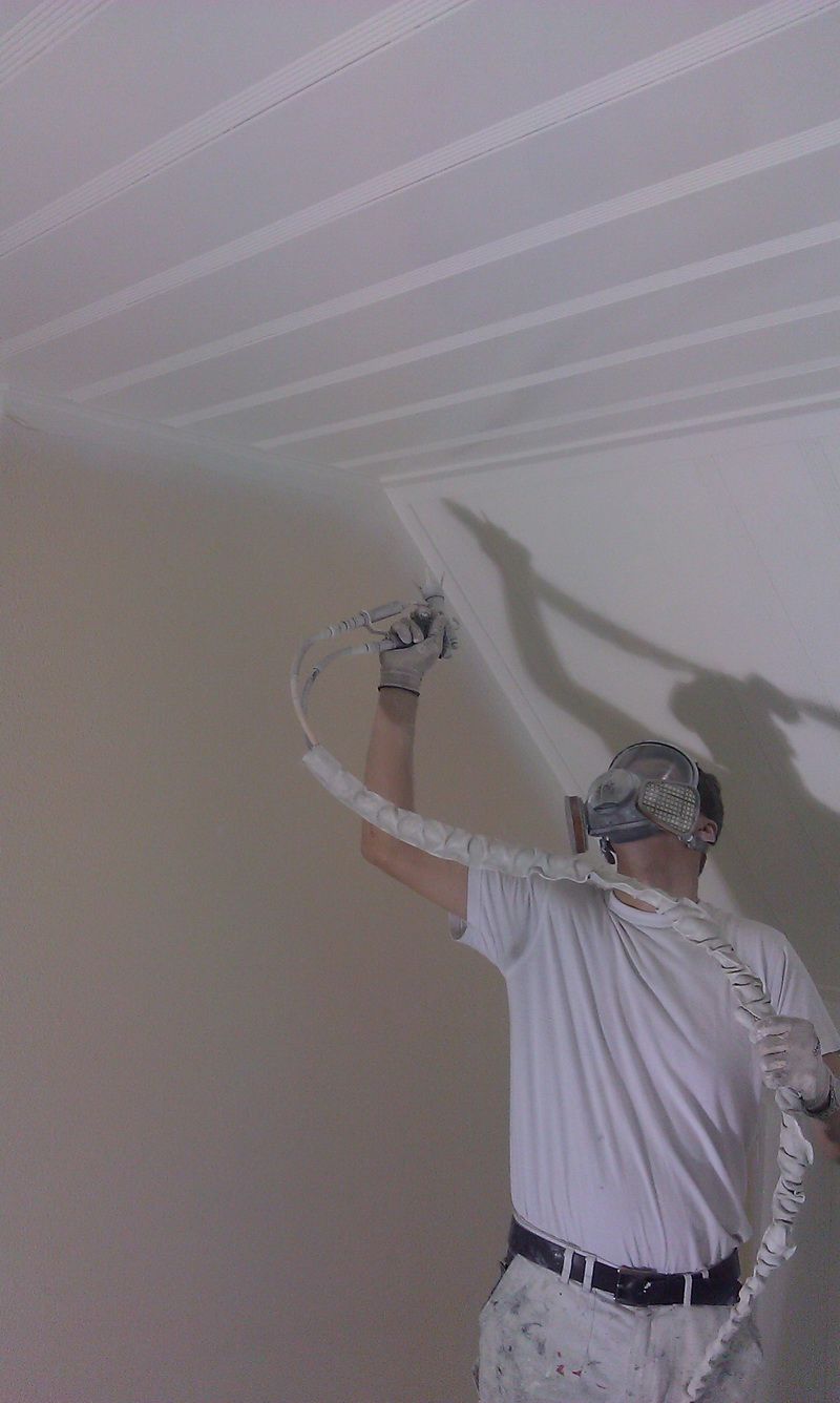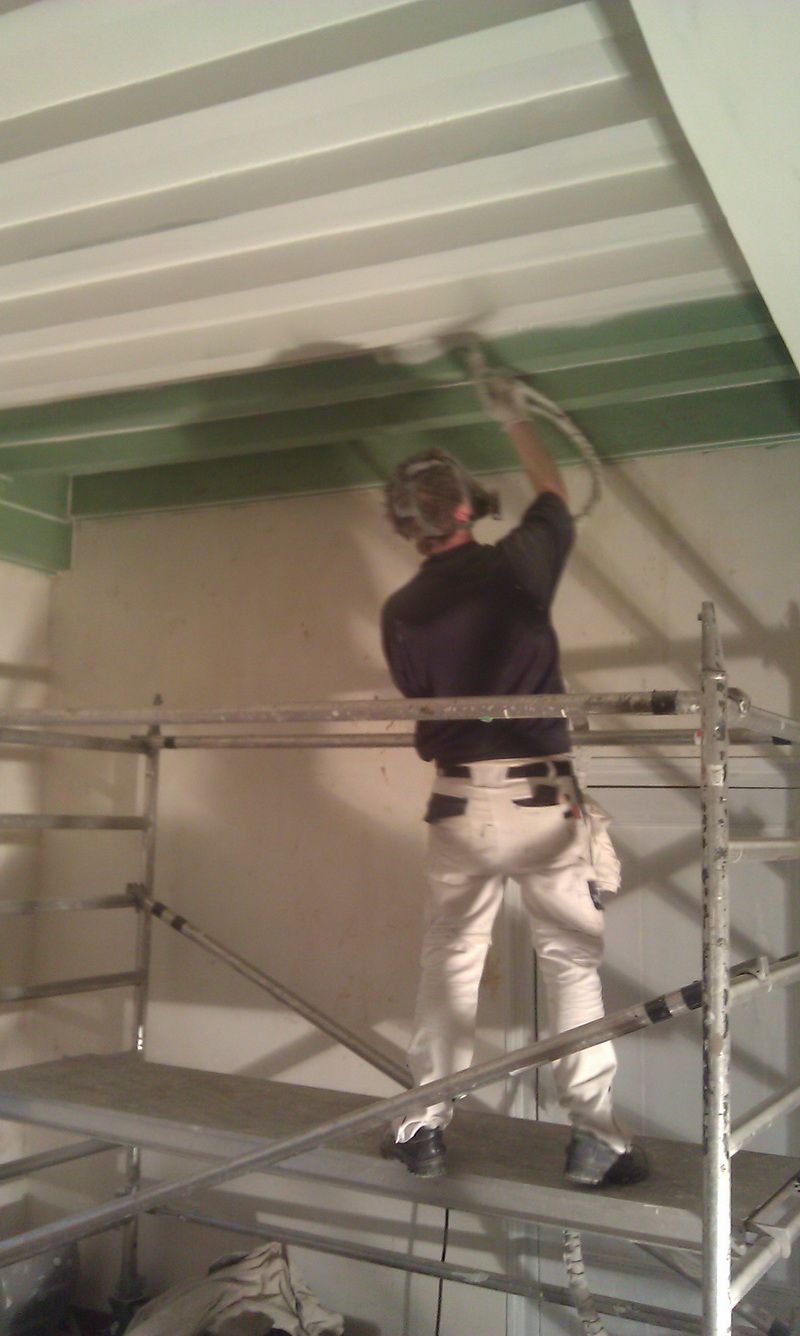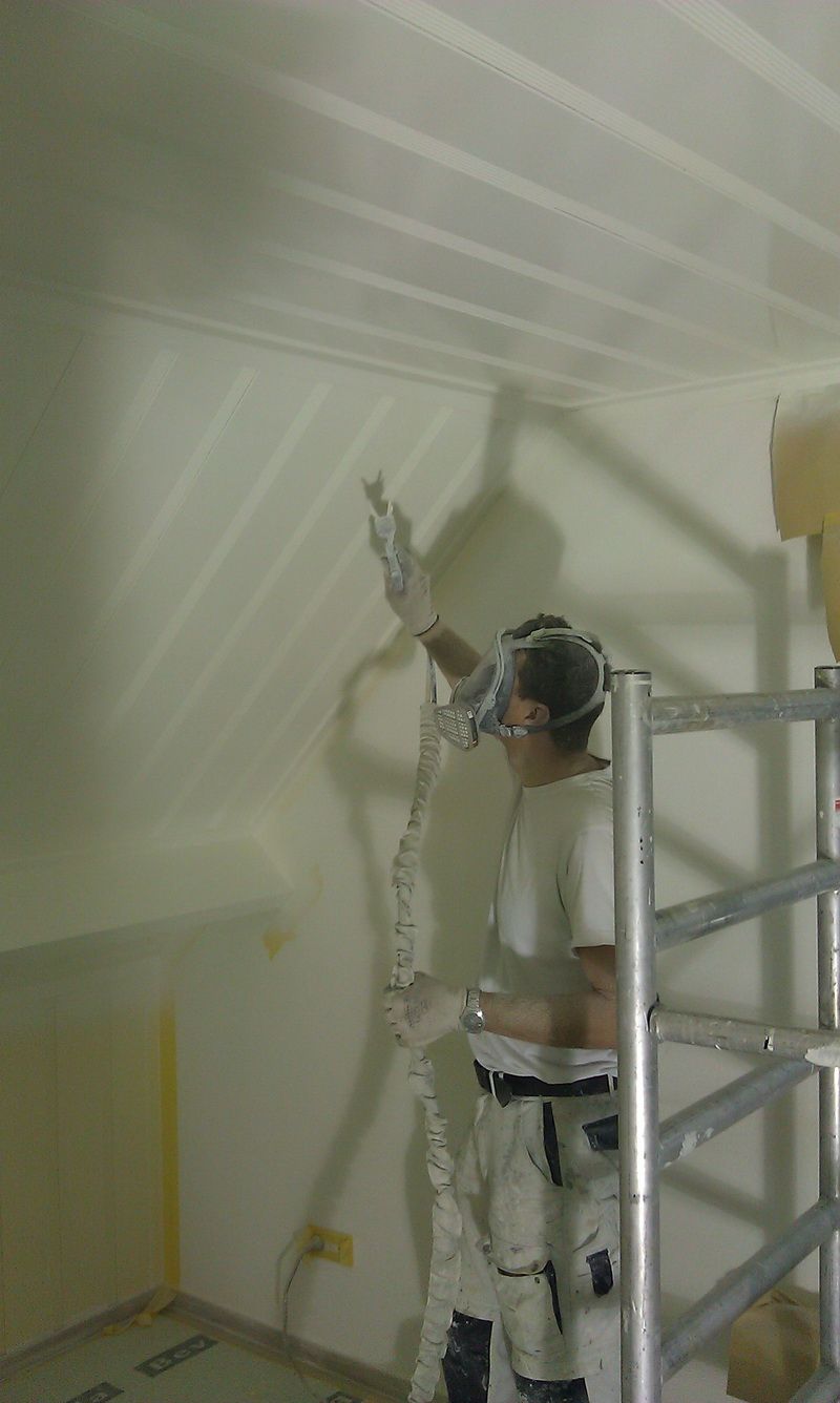 Maar ook latex kan, zonder roleffect dus, gespoten worden op plafonds en wanden.